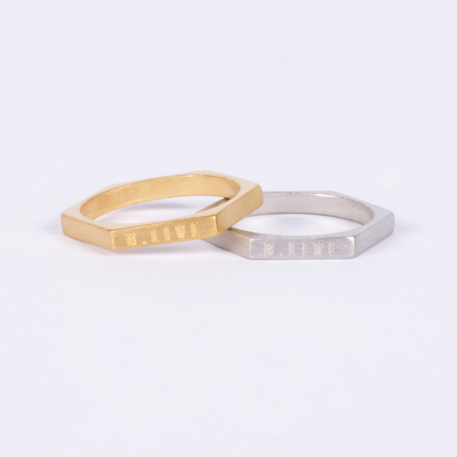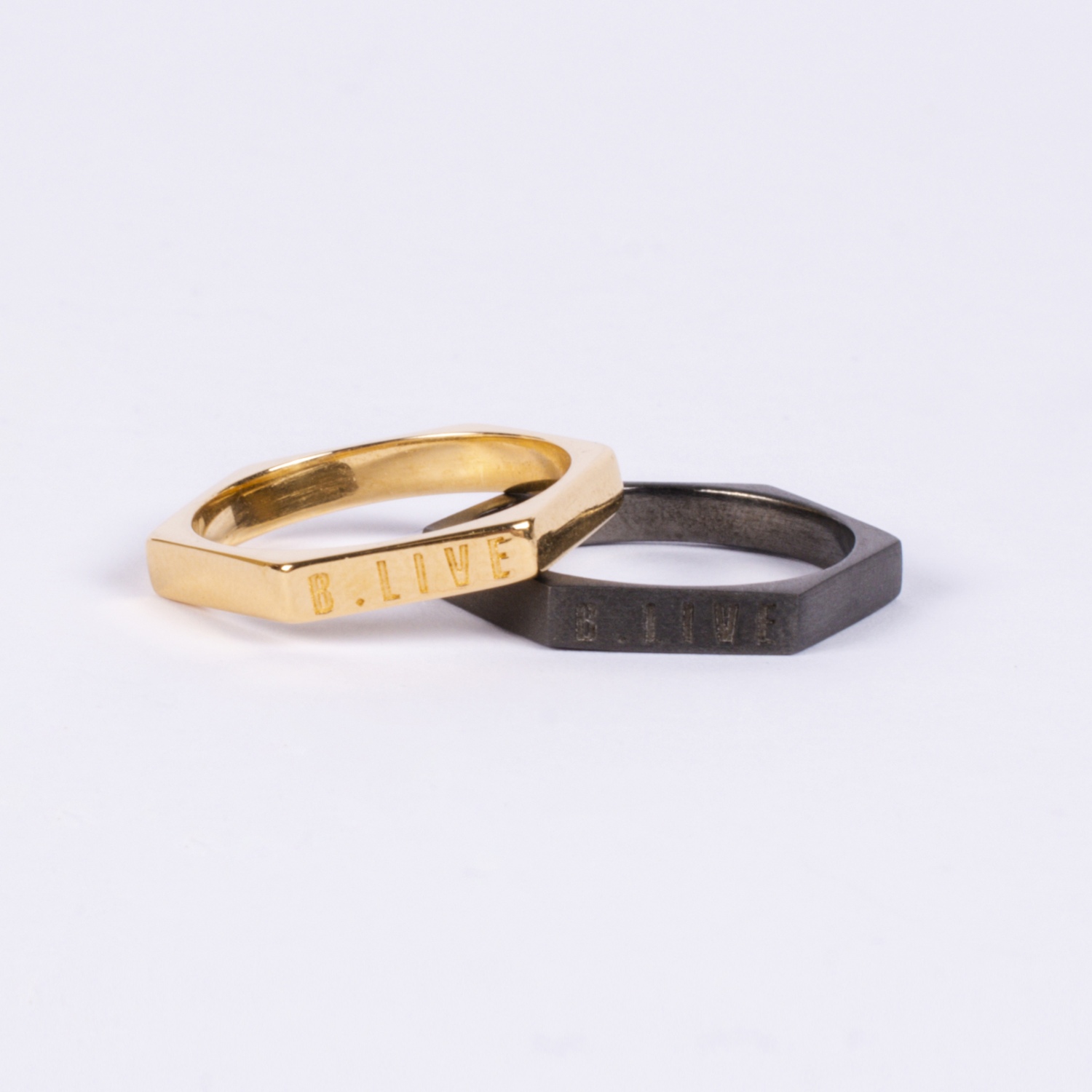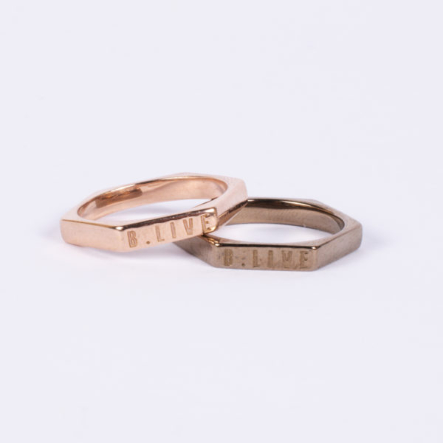 Anello a veretta in bronzo galvanizzato, 0,3 cm di larghezza, 0,1 cm di spessore. Realizzato a mano, nichel free. Incisione B.LIVE su singola faccia dell’anello