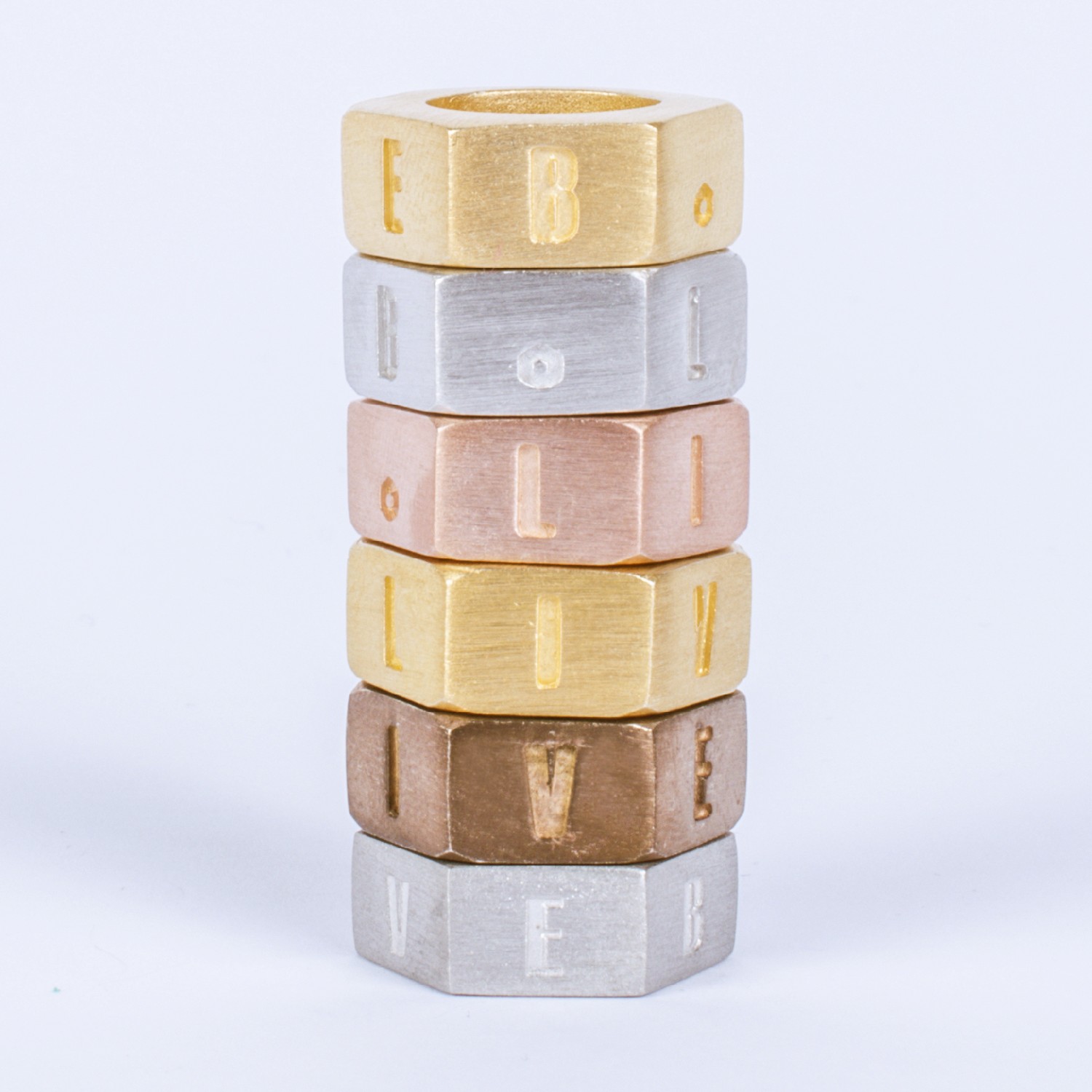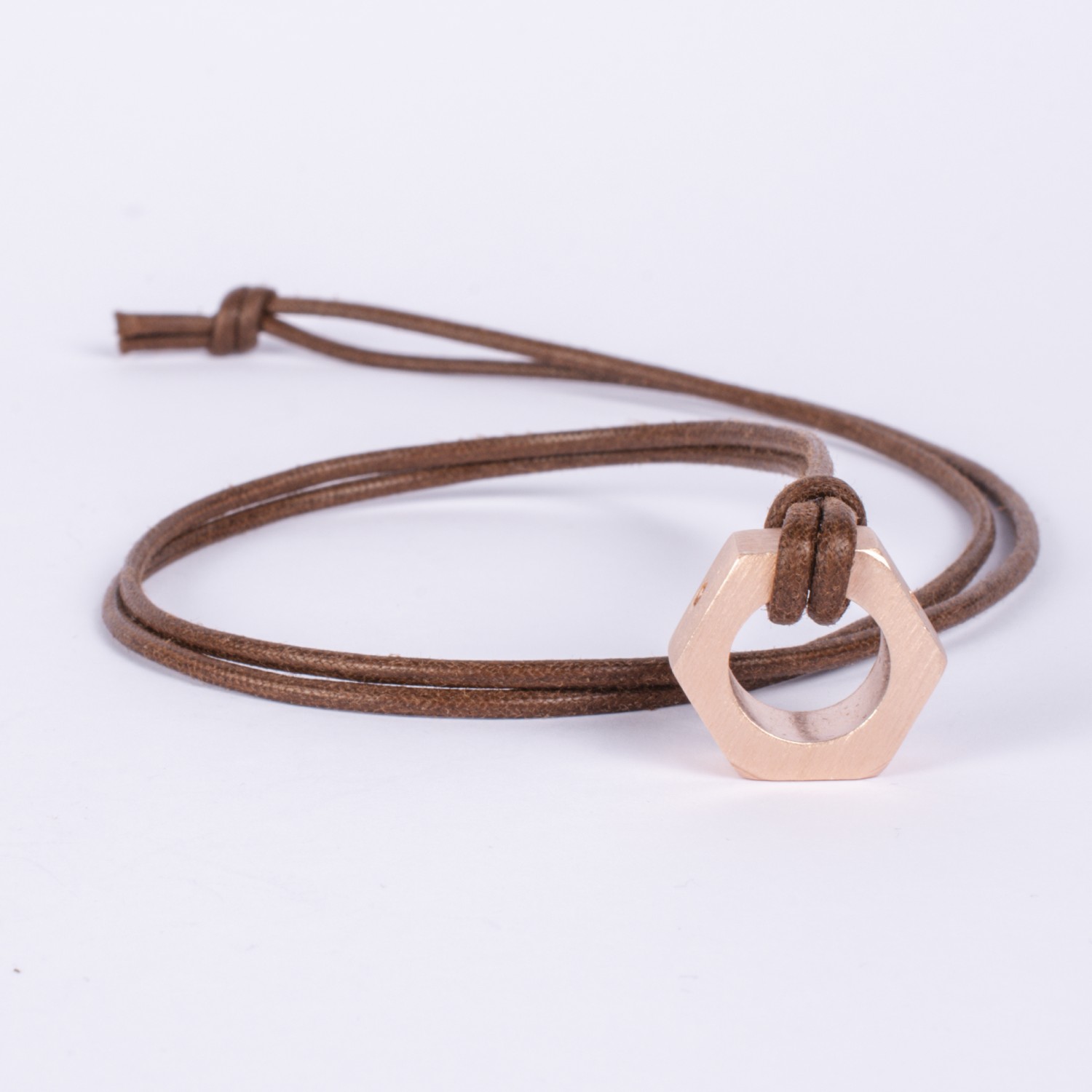 Ciondolo a forma di bullone con cordino di cuoio, 6 facce, incisione B.LIVE – una lettera per faccia del bullone. Realizzato a mano, in bronzo galvanizzato, nichel free.